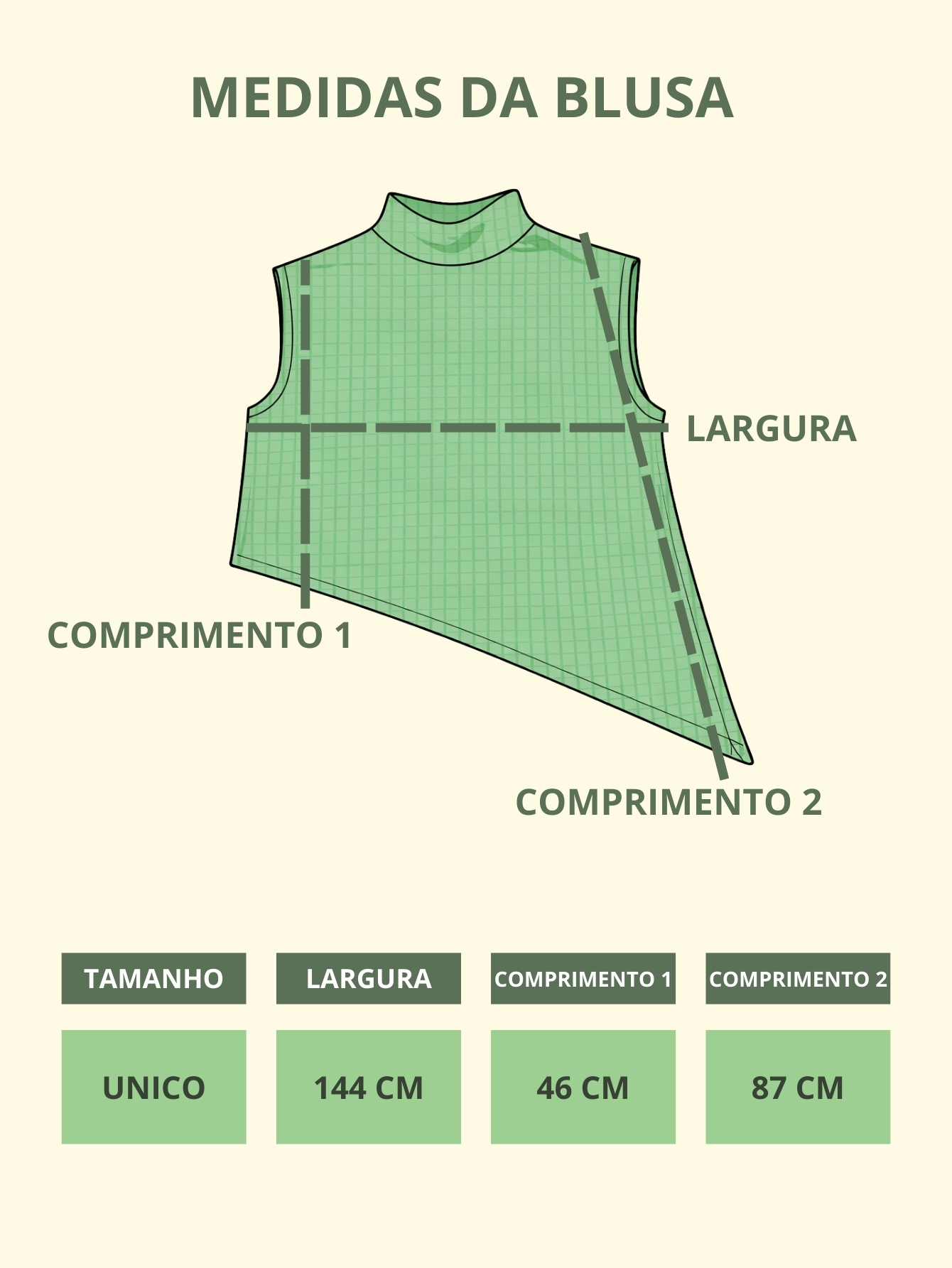 Modelagem: Pantalona de cintura alta e blusa com gola levemente alta e barra assimétrica.